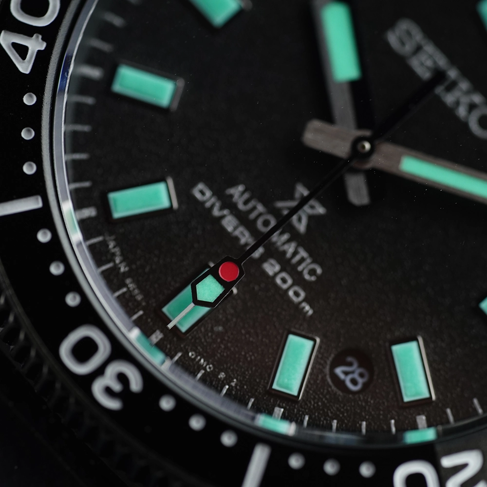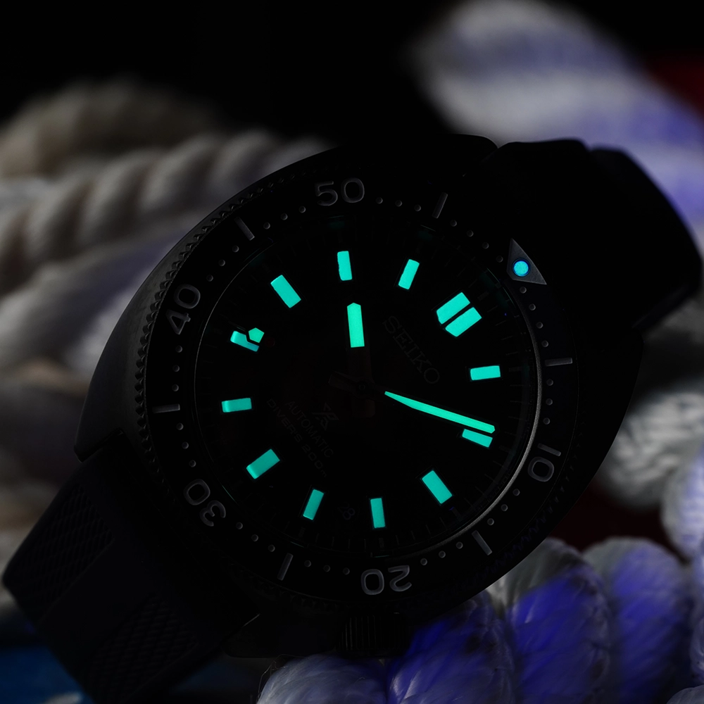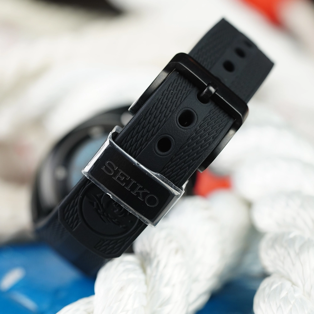 Матеріал корпусу – нержавіюча сталь 316L з покриттям Diashield. Ремінець силіконовий із стандартною застібкою-пряжкою. На стрілки та мітки нанесено підсвічування LumiBrite Green Pro – власний запатентований склад Seiko. За 10 хвилин поглинає світло, достатнє для свічення стрілок на 3-5 годин. Циферблат захищає сапфірове скло з антивідблисковим покриттям. Є індикатор дати. Задня кришка і заводна головка загвинчуються.