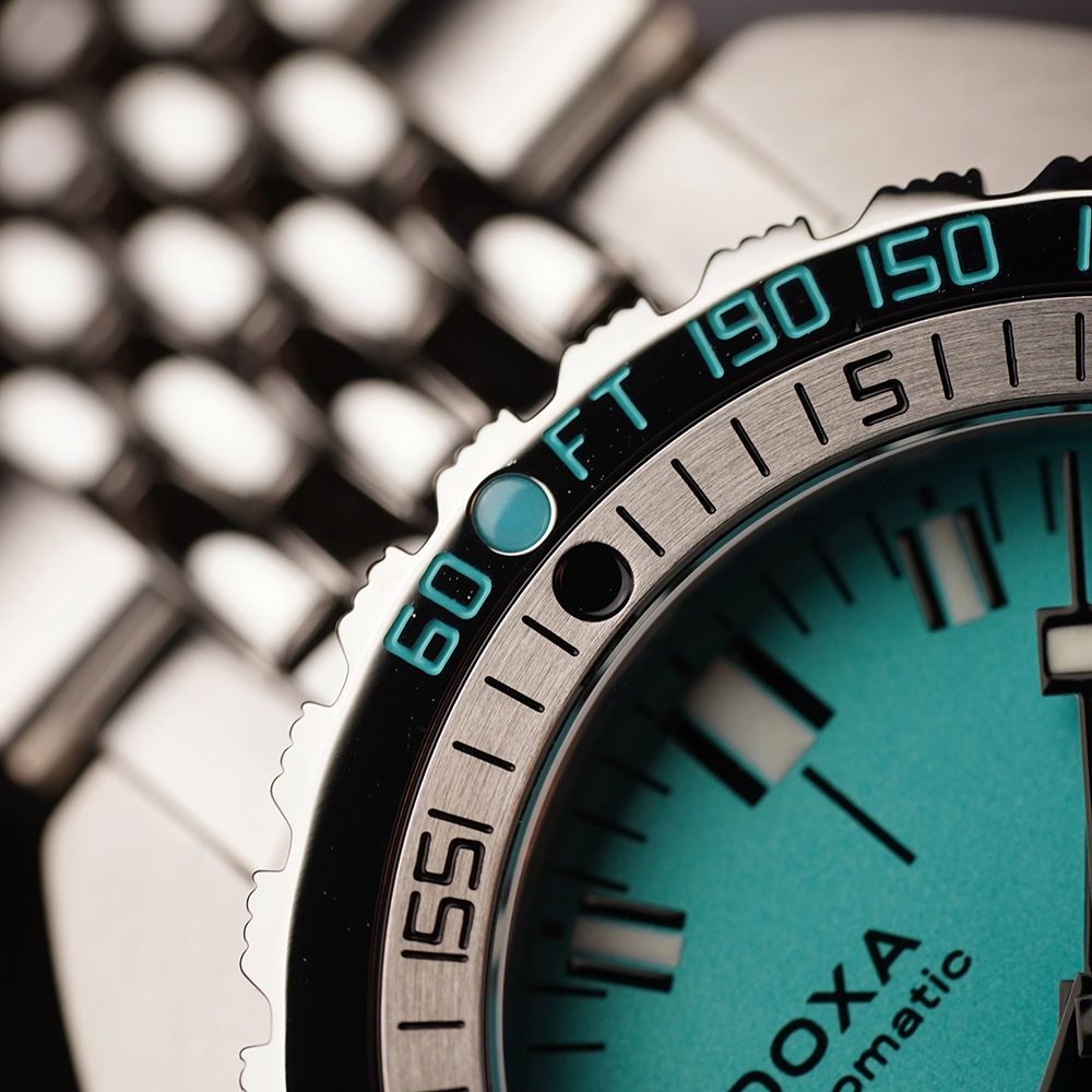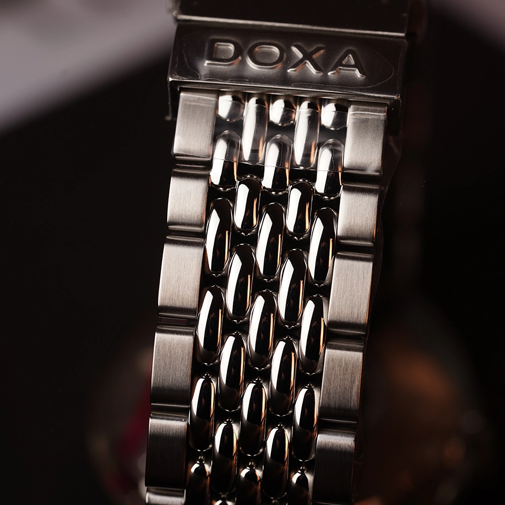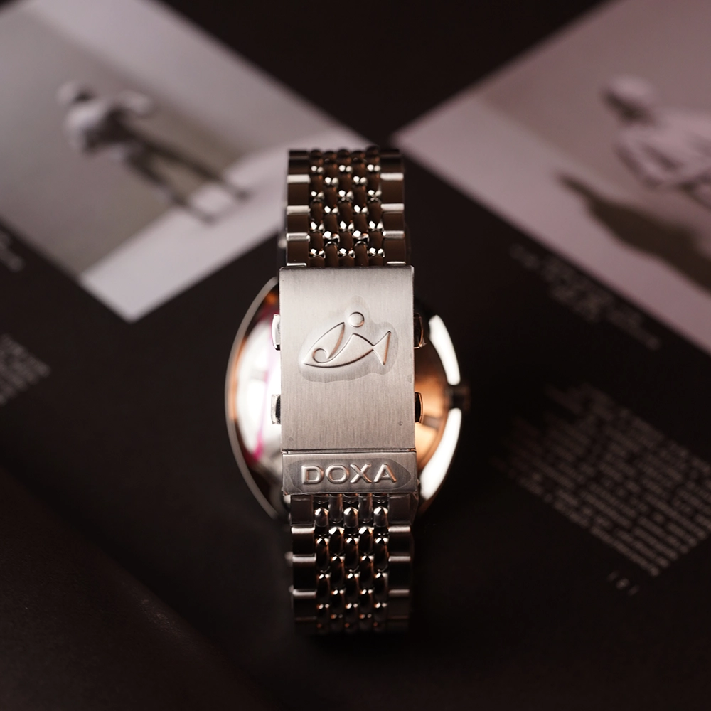 Годинник має вже культовий сталевий браслет з «рисовими бусинами». Застібка браслета, що розкладається, з логотипом DOXA у вигляді риби оснащена подовжувачем для гідрокостюма. Також в комплекті є каучуковий ремінець з характерними знаками DOXA з обох боків, що відповідають кольору циферблата.