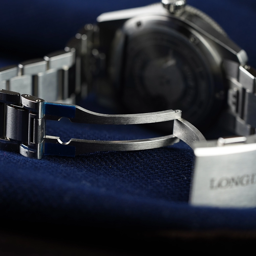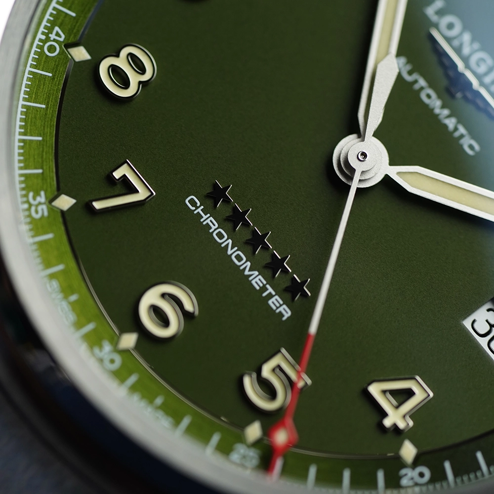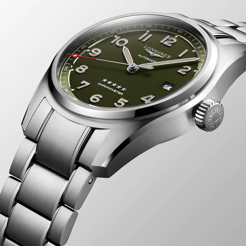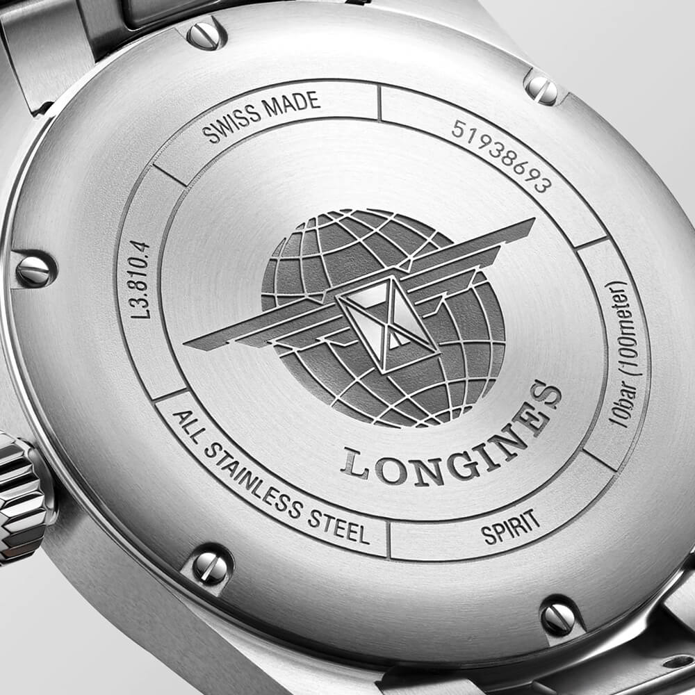 Часы Longines Spirit обладают такими элементами как большая заводная головка, ярко выраженная приподнятая над стеклом часть корпуса, крупный шрифт циферблата и стрелки в форме baton.