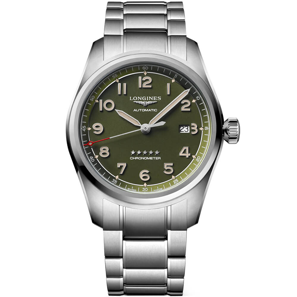 Часы Longines Spirit обладают такими элементами как большая заводная головка, ярко выраженная приподнятая над стеклом часть корпуса, крупный шрифт циферблата и стрелки в форме baton.
