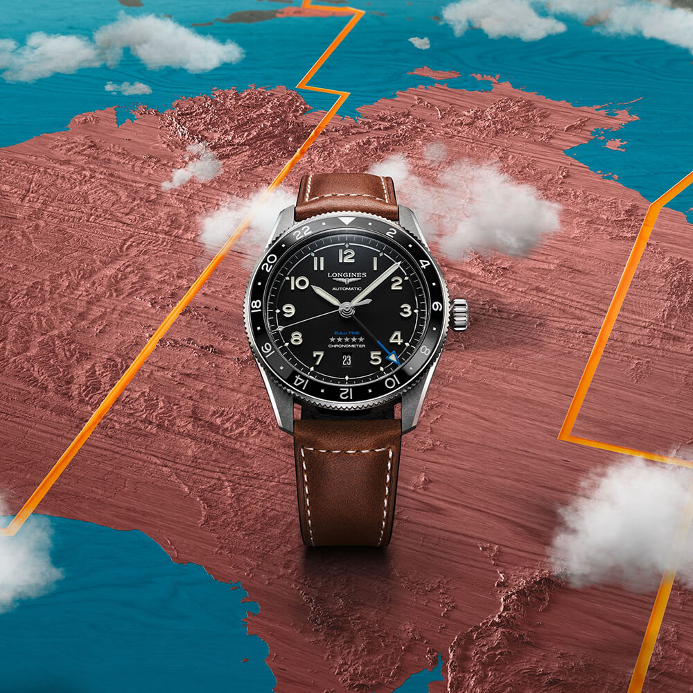 Годинник Longines Spirit має такі елементи як велика заводна головка, яскраво виражена піднята над склом частина корпусу, великий шрифт циферблата і стрілки у формі baton.