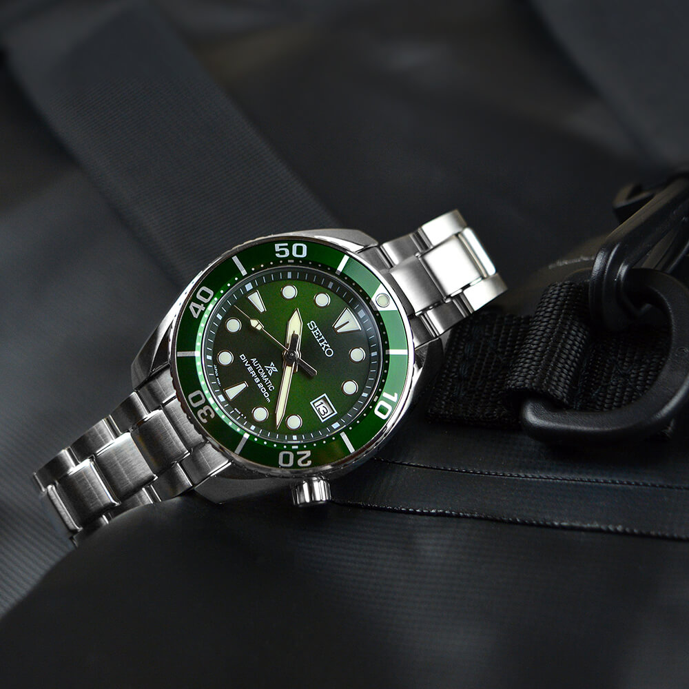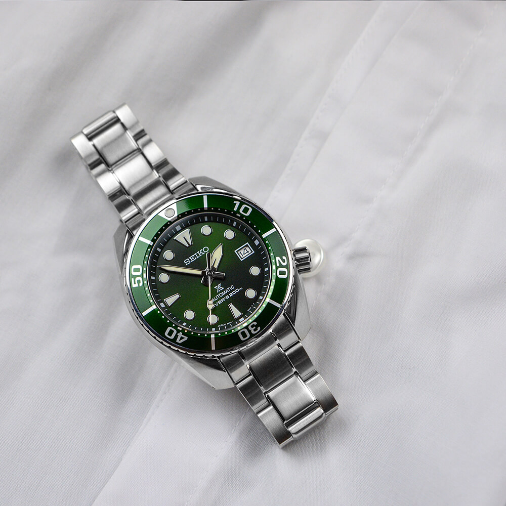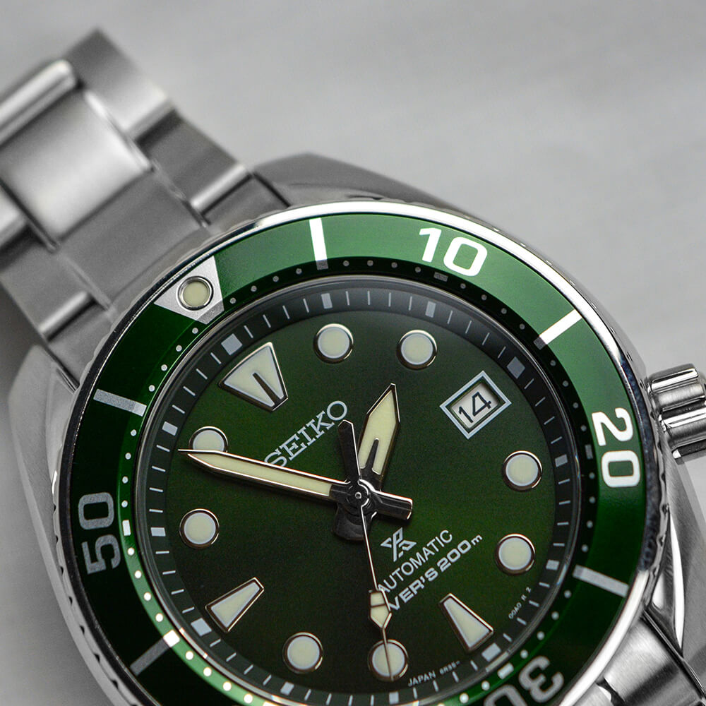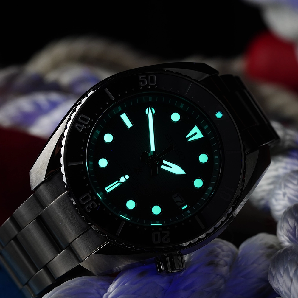 Материал корпуса и браслета - нержавеющая сталь 316L с супер стойким покрытием Diashield. Браслет со специальной системой, которая позволяет увеличить размер браслета для ношения часов на гидрокостюме. На стрелки и метки нанесена подсветка LumiBrite - собственный запатентованный состав Seiko. За 10 минут поглощает свет, достаточный для свечения стрелок на 3-5 часов. Циферблат защищает сапфировое стекло с антибликовым покрытием. Есть индикатор даты. Задняя крышка и заводная головка завинчивающиеся.