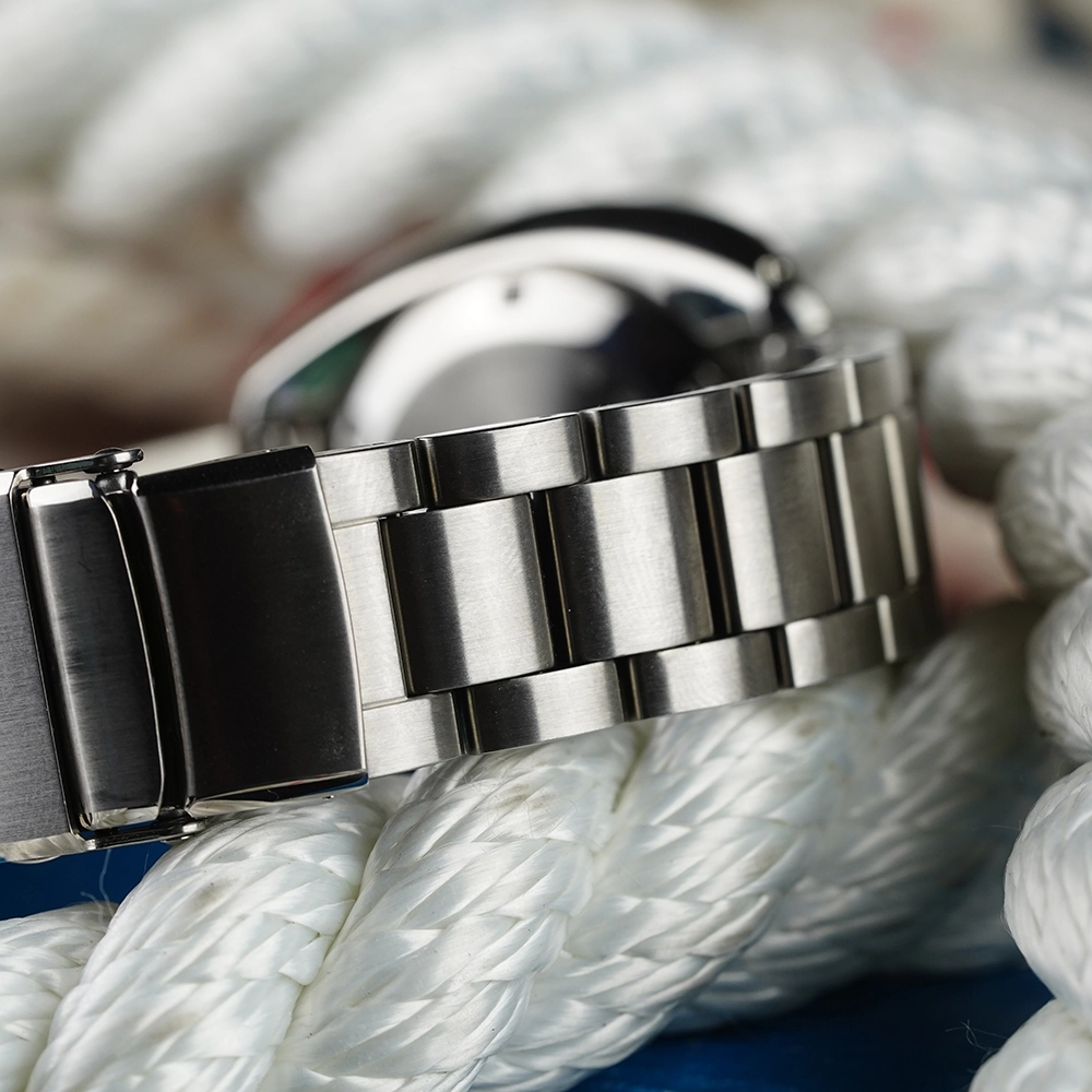Материал корпуса и браслета - нержавеющая сталь 316L с дополнительным покрытием Diashield, которое увеличивает устойчивость к царапинам. На стрелки и метки нанесена подсветка LumiBrite - собственный запатентованный состав Seiko. За 10 минут поглощает свет, достаточный для свечения стрелок на 3-5 часов. Циферблат защищает выпуклое сапфировое стекло с антибликовым покрытием. Есть индикатор даты. Задняя крышка и заводная головка завинчивающиеся.