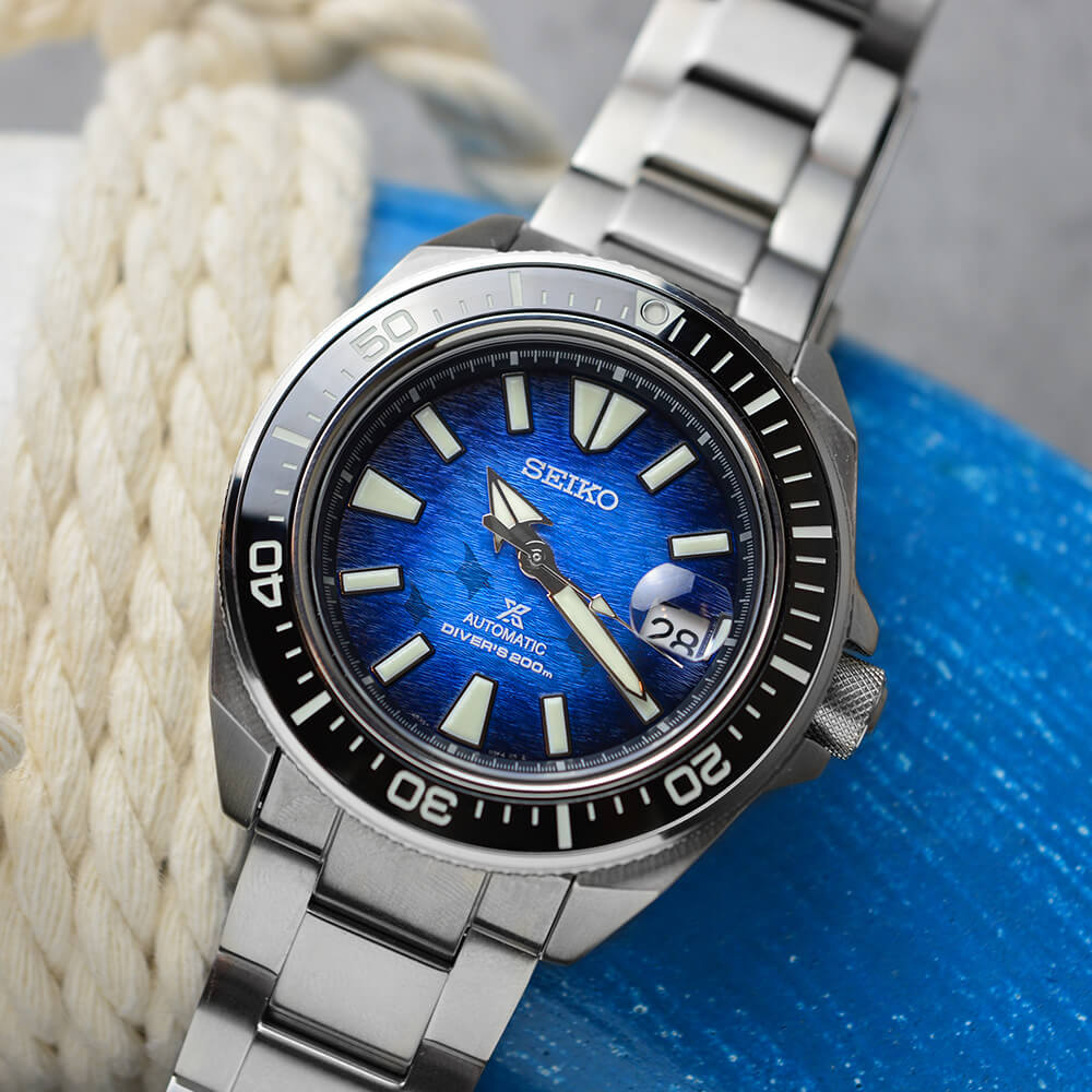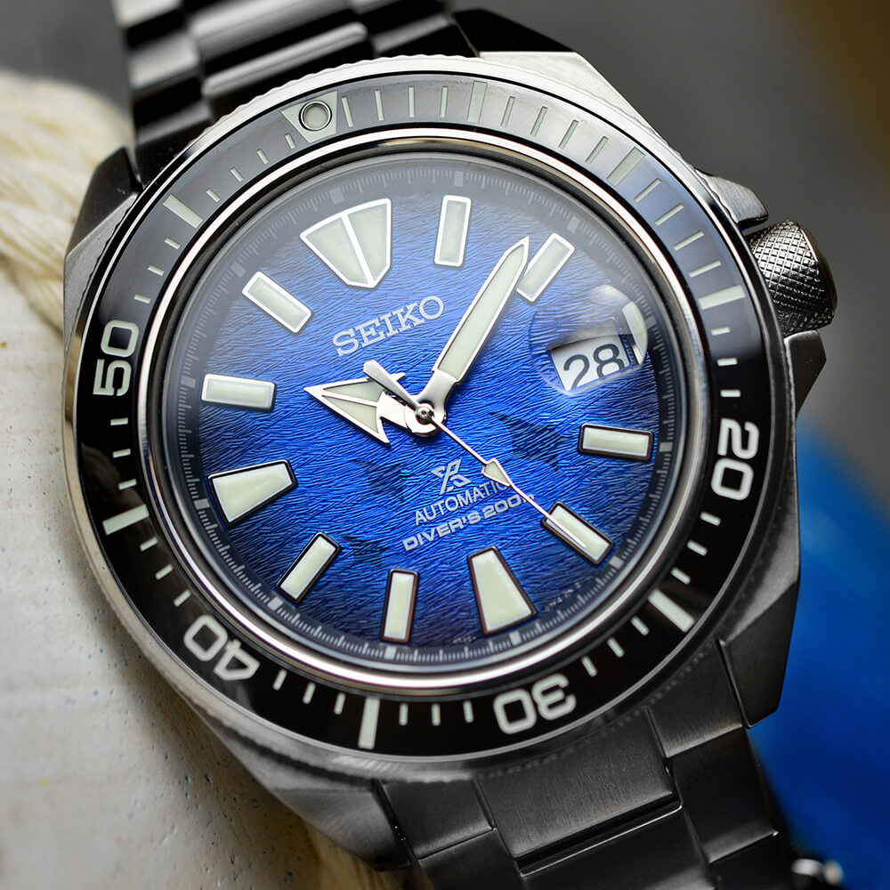 Годинник Seiko King Samurai Save the Ocean Dark Manta SRPE33K1 - новинка в спортивній колекції Prospex із сапфіровим склом та керамічним безелем. Корпус годинника називається Самурай завдяки рубаним граням годинника і міткам, які нагадують самурайський меч. На задній кришці вигравірувано цунамі.
