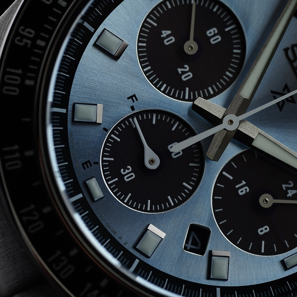 Материал корпуса и браслета - нержавеющая сталь 316L. Браслет имеет раскладывающуюся литую застежку. Ширина браслета 21 мм. На стрелки и метки нанесена подсветка LumiBrite - собственный запатентованный состав Seiko. За 10 минут поглощает свет, достаточный для свечения стрелок на 3-5 часов. Циферблат защищает сапфировое стекло с антибликовым покрытием. Есть индикатор даты и тахиметрическая шкала.